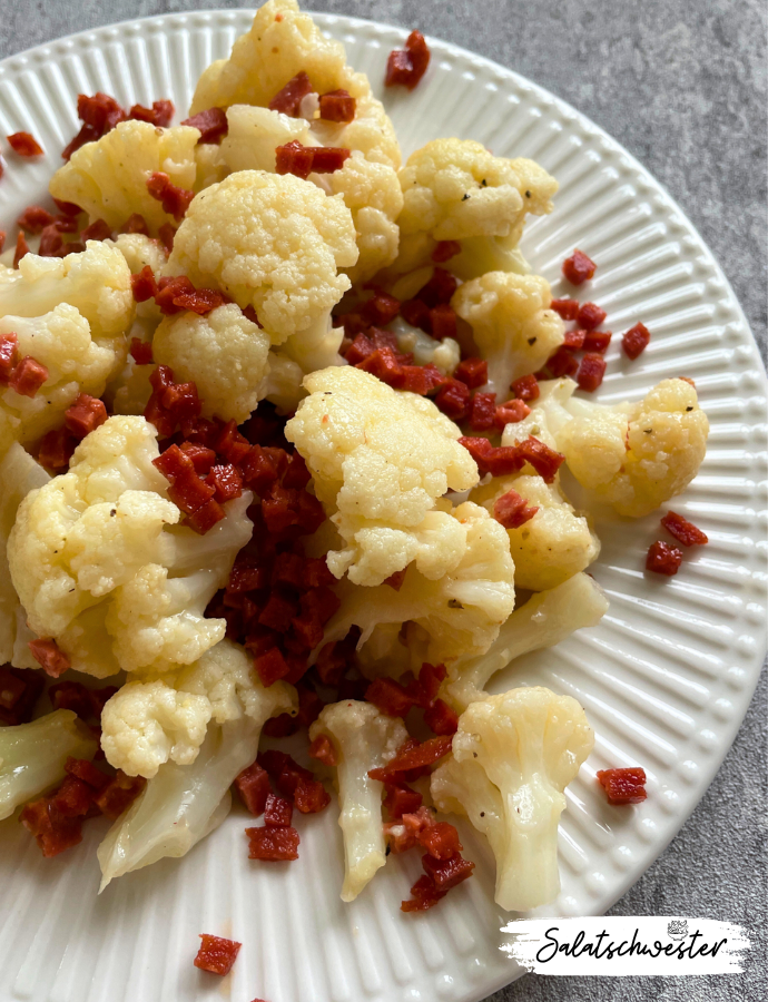 Besonders in der Herbst- und Winterzeit, wenn man nach etwas Deftigem sucht, aber nicht zu schwer essen möchte, ist dieser Blumenkohlsalat eine tolle Wahl. Er kann als Beilage zu vielen Gerichten serviert oder als Hauptmahlzeit genossen werden. Dank der veganen Schinkenwürfel ist der Salat nicht nur proteinreich, sondern bringt auch eine angenehm rauchige Note mit, die perfekt mit dem milden Blumenkohl harmoniert.